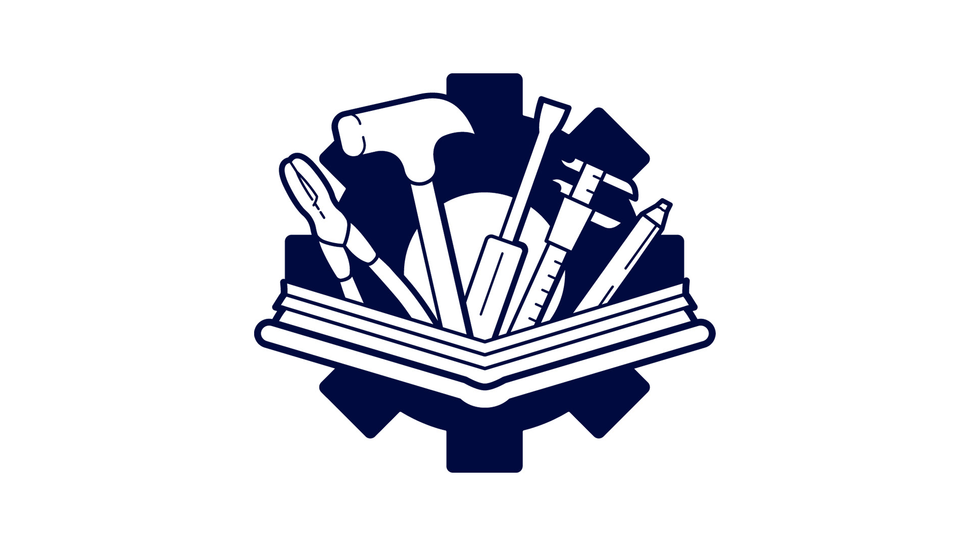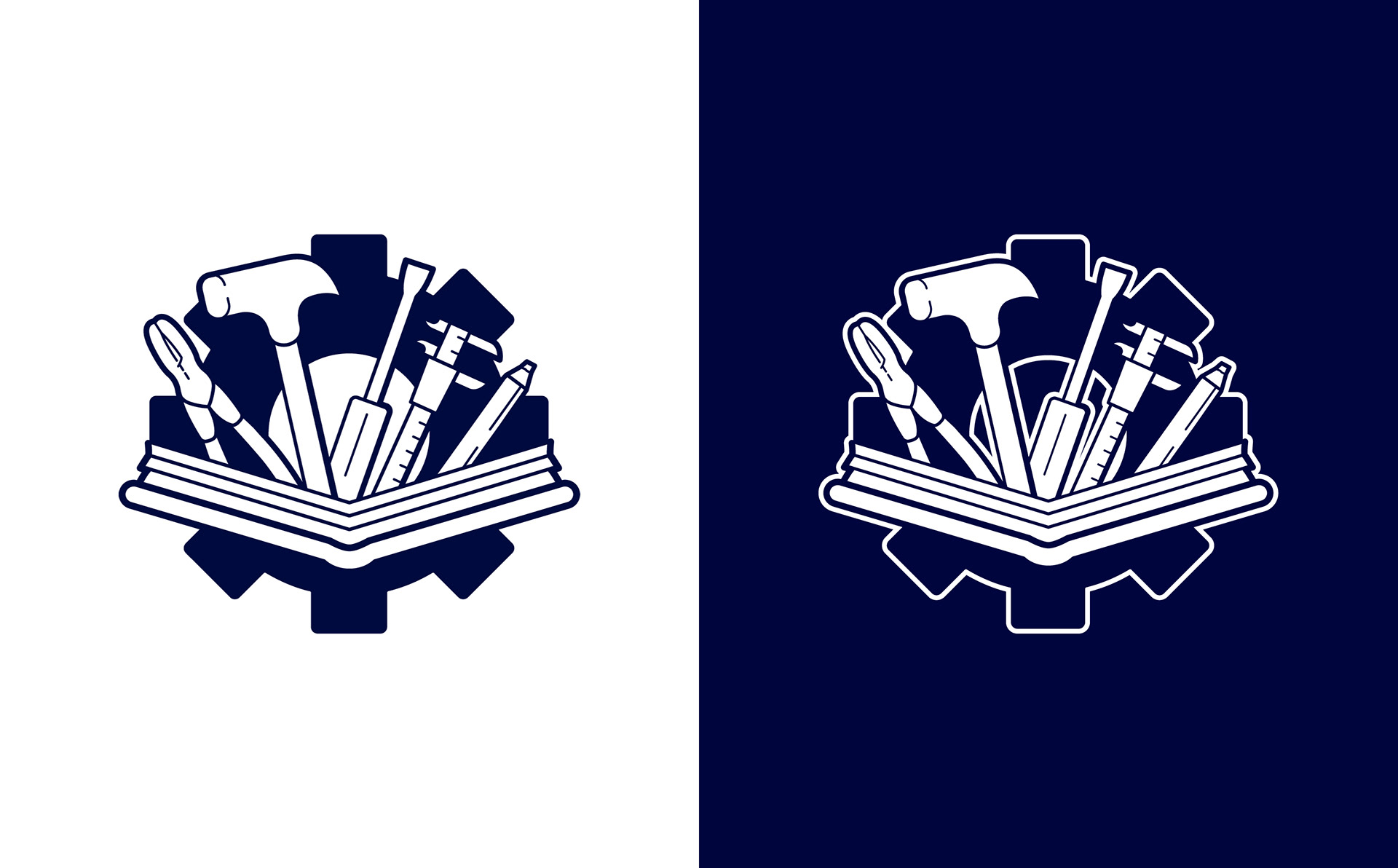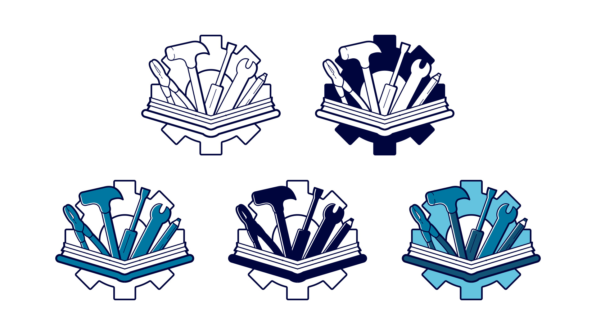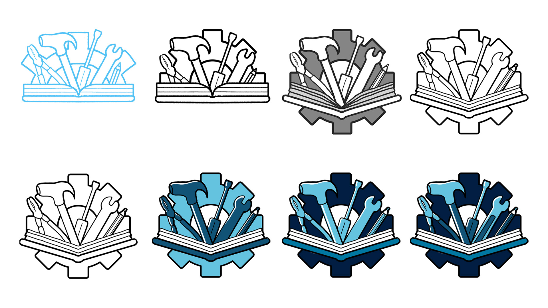 The final icon shows a collection of tools associated with apprenticeships emerging from an open book set in front of a gear symbol. Per request, the wrench was swapped out for a caliper in the final version. To ensure versatility, the single color icon was modified for dark backgrounds using an offset stroke, keeping the icon clear and legible in all contexts.