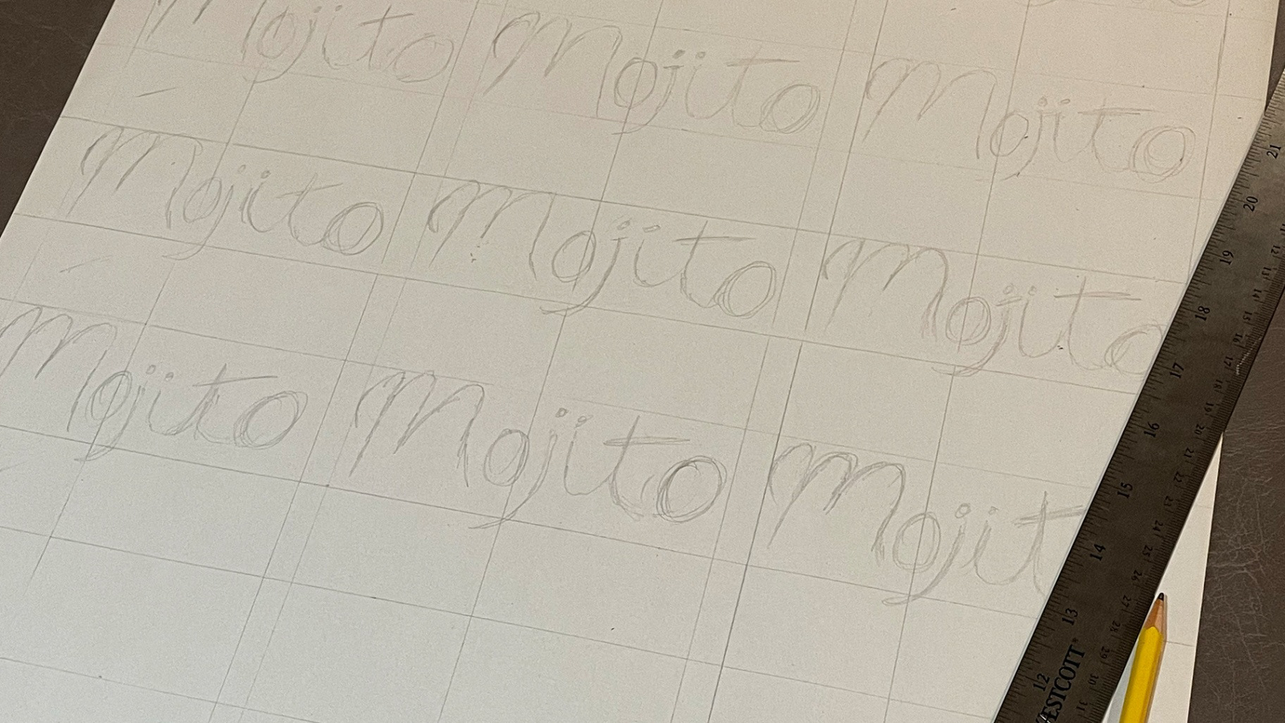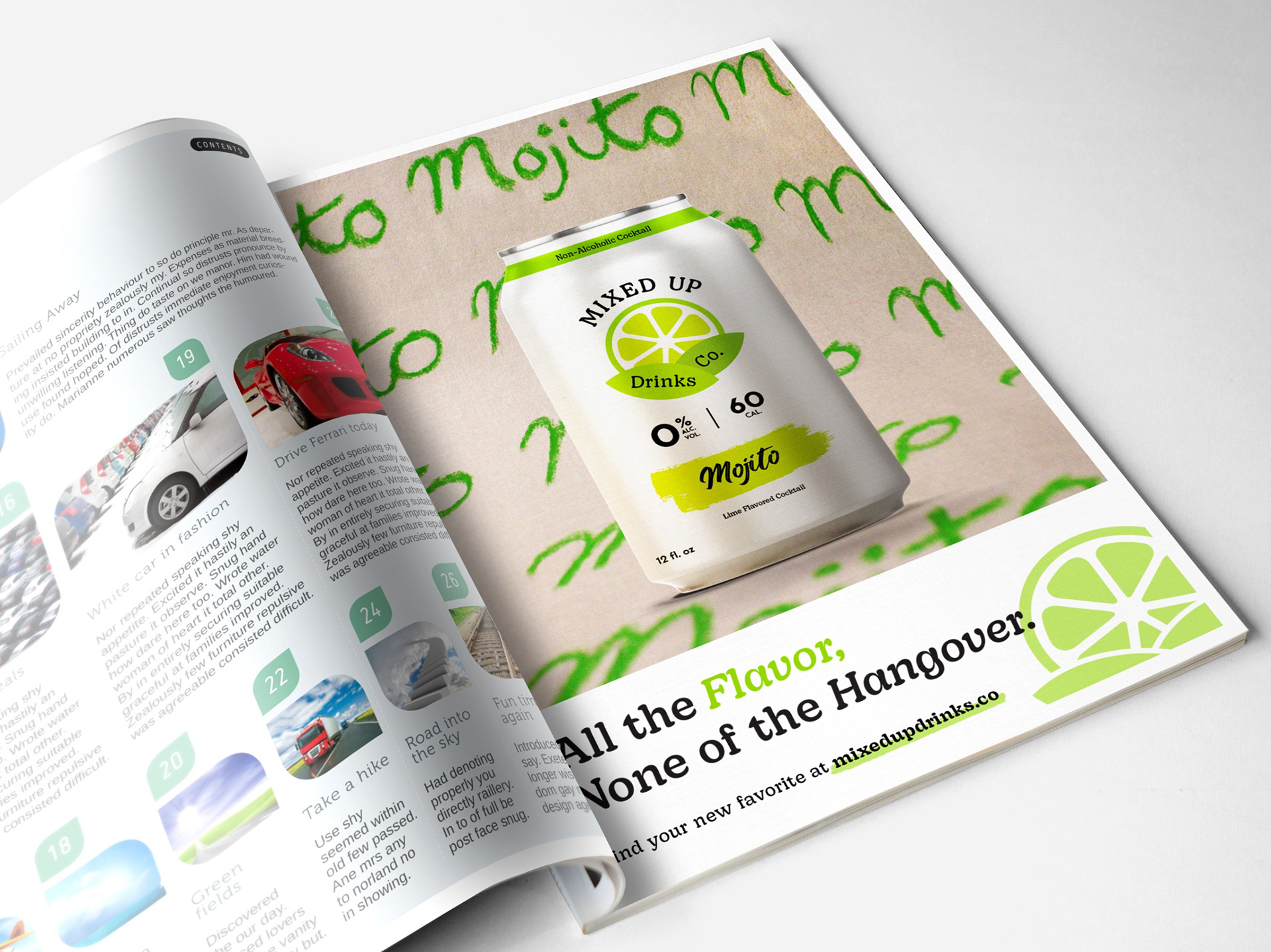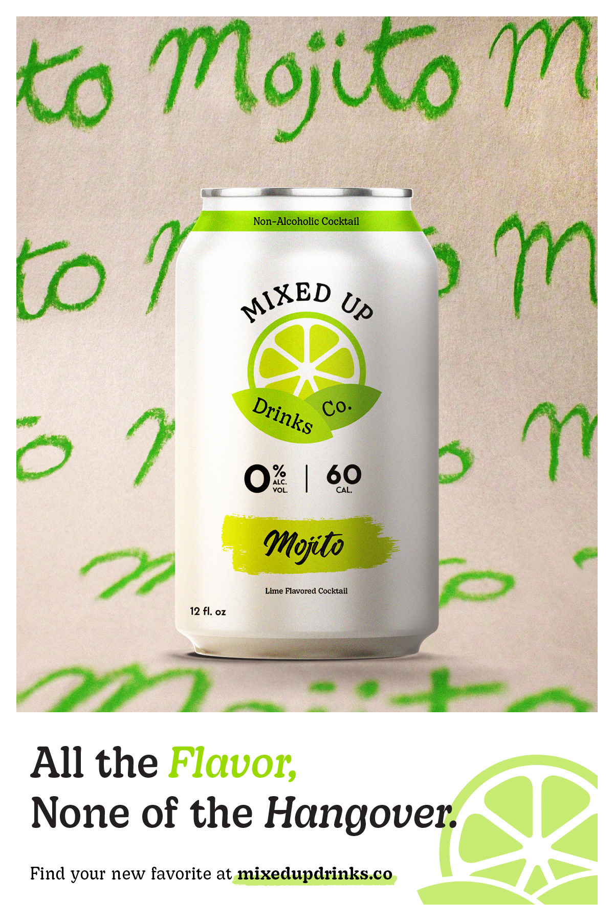 The can designs lean into bold brush lettering and minimal layouts to capture the energy of the cocktails in a clean, modern way. A hand-drawn backdrop illustration, built from the type used for the flavor names, ties everything together for the Mojito print ad.